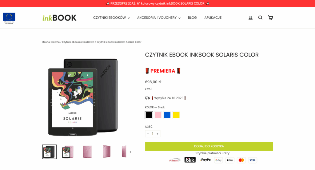 inkBOOK to polska marka od lat rozwijająca własne czytniki na Androidzie. Solaris Color to kolorowy następca Solarisa — kierowany do osób, które poza tekstem chcą wygodnie oglądać ilustracje, komiksy czy materiały edukacyjne. Zachowuje prosty interfejs i wsparcie wybranych aplikacji, a jednocześnie wprowadza nowy ekran w kolorze.