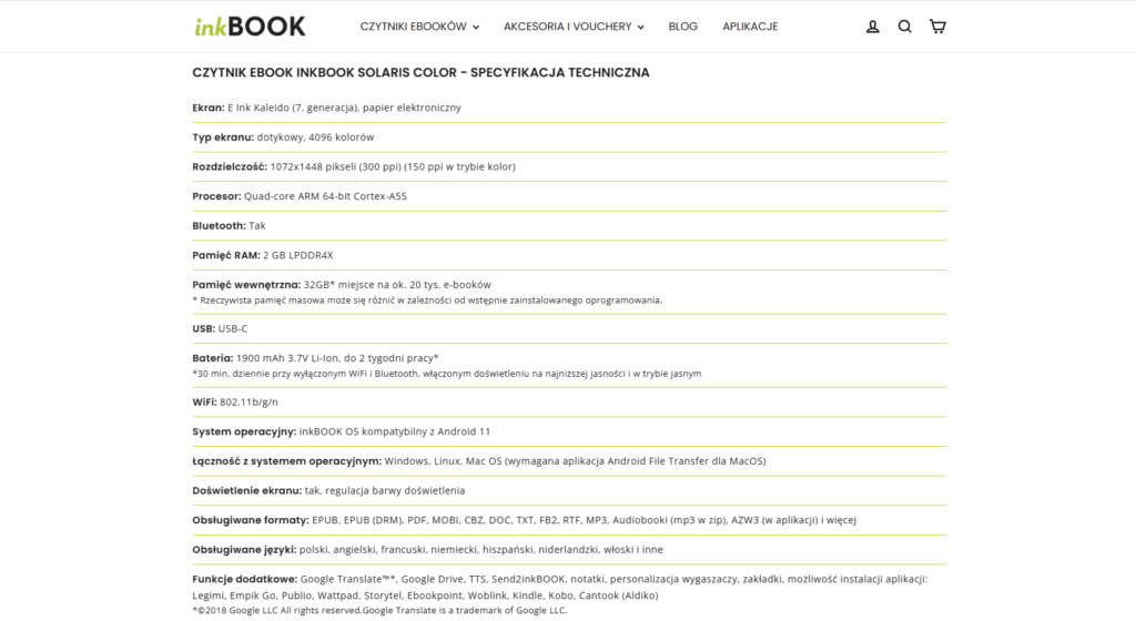 Solaris Color działa na inkBOOK OS (Android 11), więc uruchomisz wybrane aplikacje przewidziane przez producenta — m.in. Legimi, Empik Go, Publio, Woblink, Ebookpoint, Storytel, Wattpad oraz narzędzia typu Google Translate i Google Drive. Nie ma Google Play, więc katalog programów jest ograniczony. Pamiętaj też: im więcej aplikacji zainstalujesz, tym mniej wolnej pamięci i tym większe zużycie baterii (synchronizacje w tle).