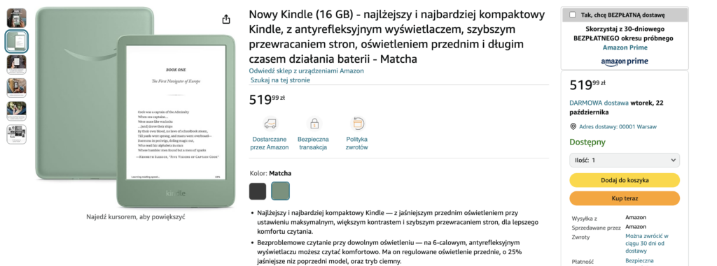 Cena nowego Kindle 2024 wynosi 519 zł, a dostępne kolory to czarny oraz nowy, elegancki Matcha (zielony).