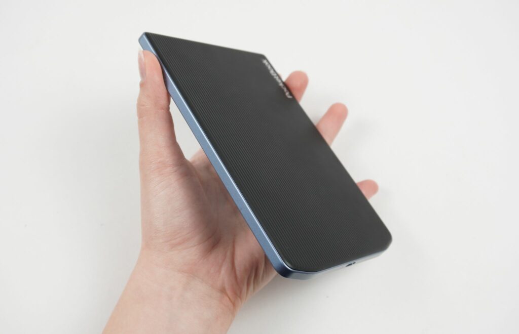 Fizyczne przyciski do zmiany stron umieszczono u dołu ekranu. PocketBook słynie z wysokiej jakości tego elementu – klawisze są precyzyjne, dają optymalny opór, przez co nie zdarzają się przypadkowe kliknięcia. Dłuższe przytrzymanie przycisku pozwala na szybkie przewijanie stron książek czy innych wielostronicowych dokumentów.