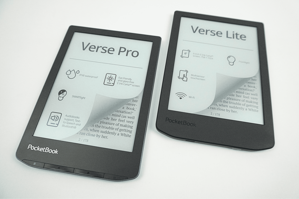 Verse Pro będzie lepszym wyborem dla wymagających – osób czytających codziennie i intensywnie, a także tych, którzy chcą korzystać z audiobooków. Wyższa rozdzielczość ekranu (300 ppi) daje ostry i wyraźny tekst, większa pamięć pomieści obszerną bibliotekę, a wodoodporność IPX8 pozwala zabrać czytnik nad wodę bez obaw. Pro to także większa elastyczność dzięki obsłudze Bluetooth i bogatszej bazie słowników.
